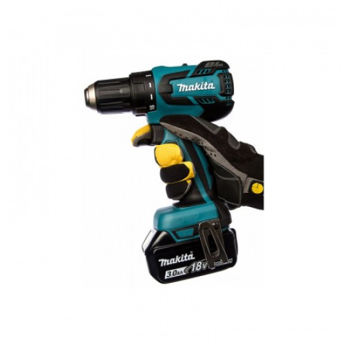 Работает дрель-шуруповерт макита DDF459RFE от аккумулятора напряжением 18В. Разъем типа слайдер позволяет использовать обычные батареи емкостью 3Ач или 4Ач, а также узкие облегченные емкостью 1.3Ач.