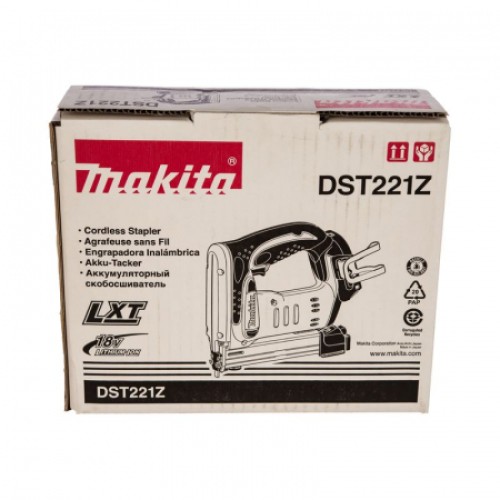 В обозначении этого агрегата, выпущенного на рынок компанией Макита в 2017 году, присутствует ещё одна аббревиатура – LXT. Это следует обязательно учитывать при приобретении к нему аккумулятора, который в комплект поставки инструмента не входит. Сам степлер Makita DST221Z – это профессиональный инструмент, предназначенный для высокопроизводительного крепления материала к деревянным заготовкам с помощью стандартных скоб размером 10 мм разной высоты и сечением 0,6х1,2 мм. Его пользователь получает следующие преимущества: