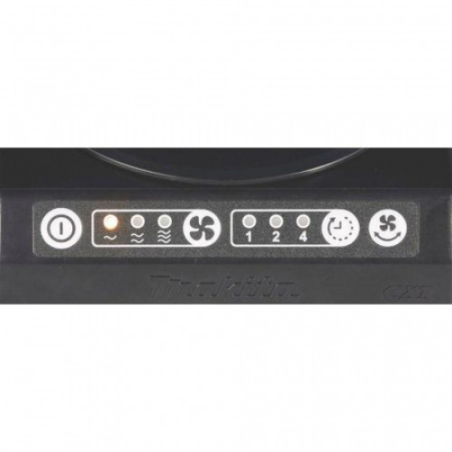 Вентилятор Makita CF101DZ оснащен панелью управления с рядом кнопок и индикацией. Включение и выключение производится одним переключателем, отдельная кнопка используется для управления скоростью. Её значение меняется от 2 до 3 м/сек при последовательном нажатии. Ещё один элемент управления – включение режима автоматического качания. Угол наклона при этом варьируется в диапазоне 90 град.